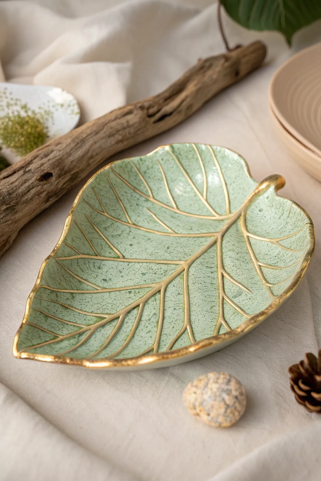 Push real sheets into clay to make sheet trays that capture detailed vein patterns. I think painting them in earthy green or shiny tones always brings out their natural charm.