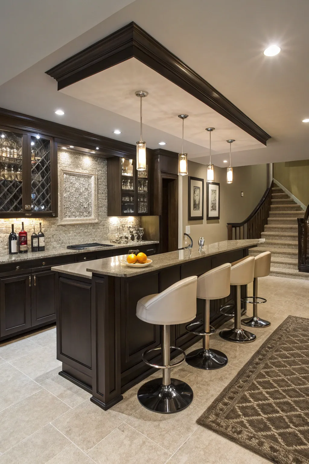 A personal bar can lend a pleasant, polished touch to a basement. I’ve created areas where an elegant bar becomes the main feature, ideal for hosting friends and de-stressing after a hectic day.