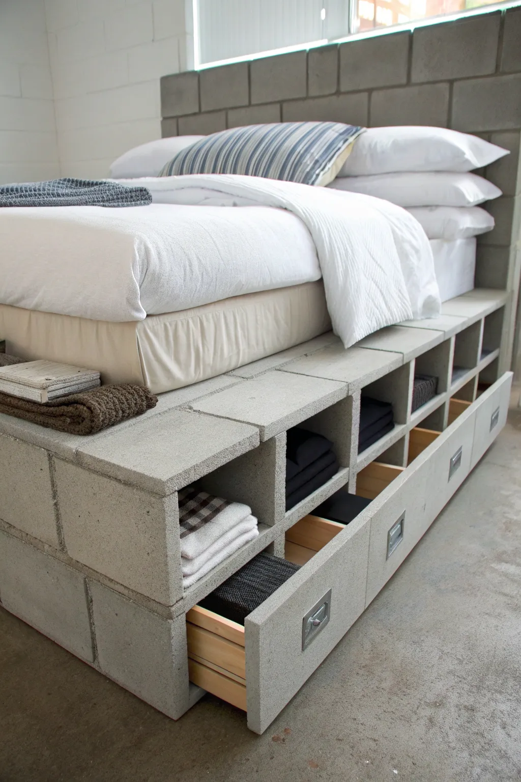 Concrete blocks offer a robust foundation for a bed base with integrated storage. Mine has been the perfect solution for stowing winter covers and extra cushions.