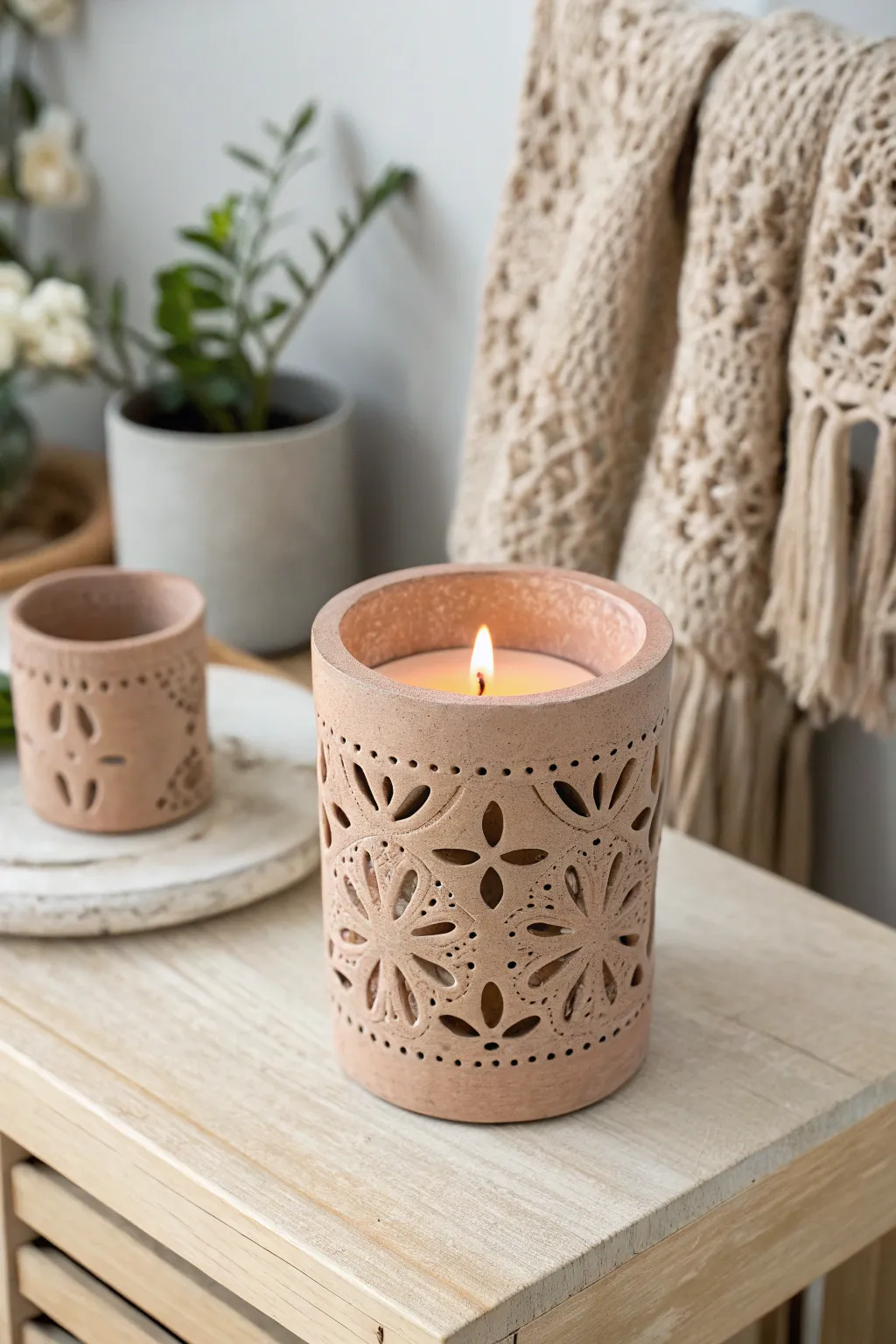 Design elegant clay glow holders for an inviting atmosphere. I crafted some showcasing elaborate cut-outs that cast gorgeous shadows, ideal for holiday tablescapes.