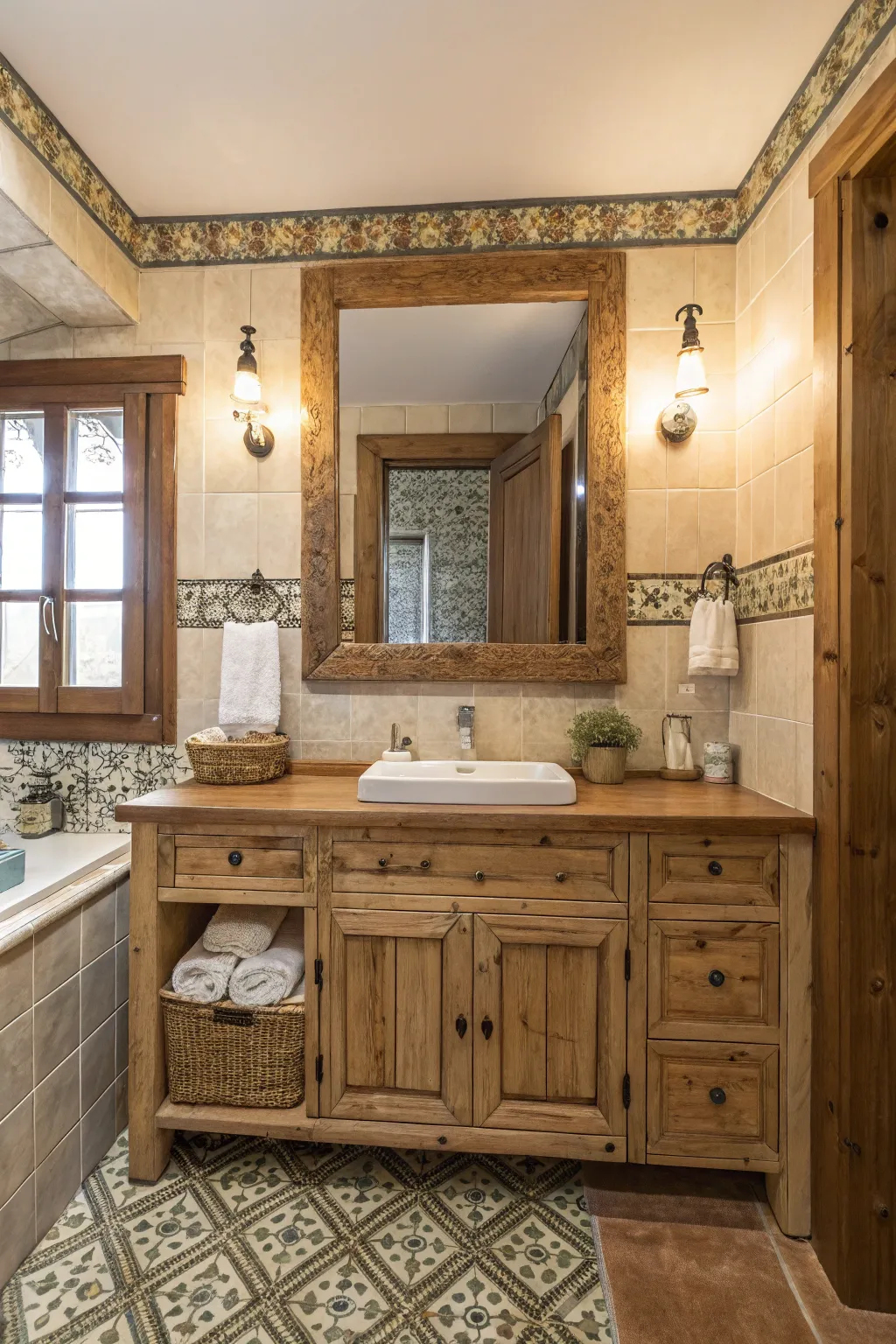 Add a patterned floor covering to your countryside bathroom, enriching texture and color. It’s a simple addition that anchors the personal space, offering comfort beneath your feet.
