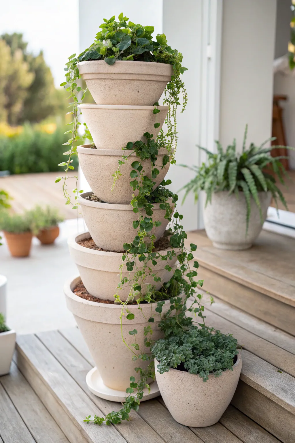 Arrange clay pots of various dimensions to produce a multilevel display perfect for showcasing trailing plants. I’ve employed this approach to introduce stature and intrigue to my deck area, and it continuously earns admiration!
