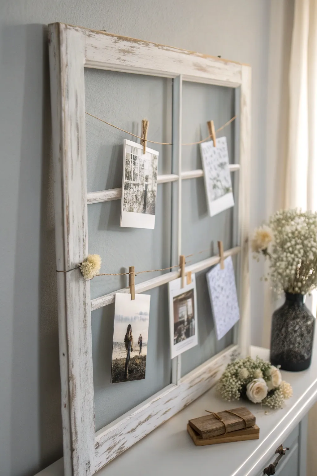 Transform an aged window pane into a bulletin board for snapshots and memos. It’s a charming avenue to showcase memories while injecting a vintage emotion to your setting.