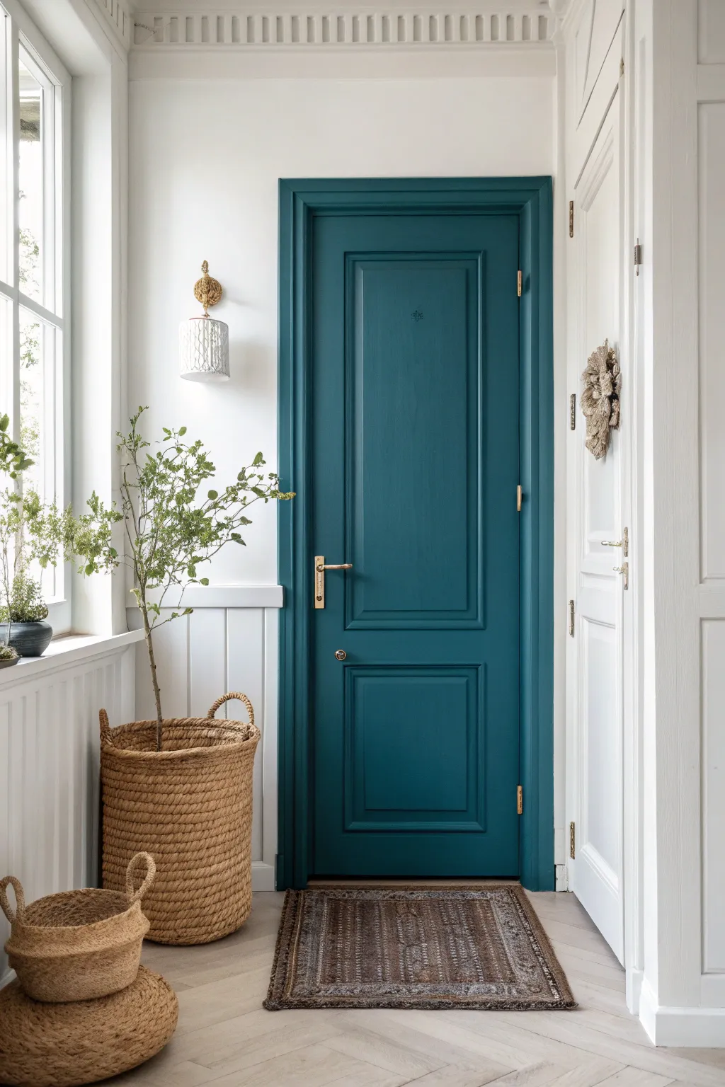 A door coated in a daring hue can be the ultimate way to inject character into a space. I went with a deep teal for my study door, and it pops magnificently against the stark white walls.