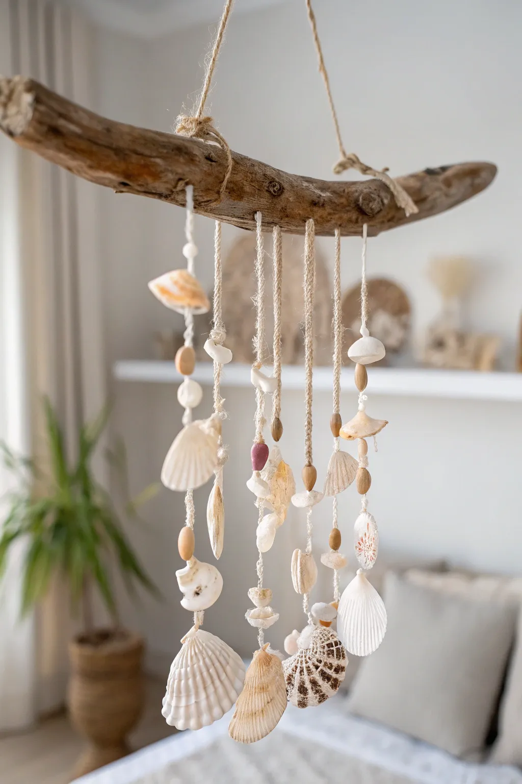 Welcome seaside peace using a crafted seashell wind chime—a simple masterpiece that sings in the wind.