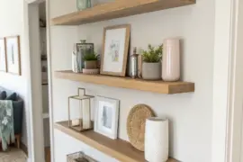 For a clean, minimalist look, use hanging shelves with hidden hardware. They look like they’re magically floating, adding a modern touch.