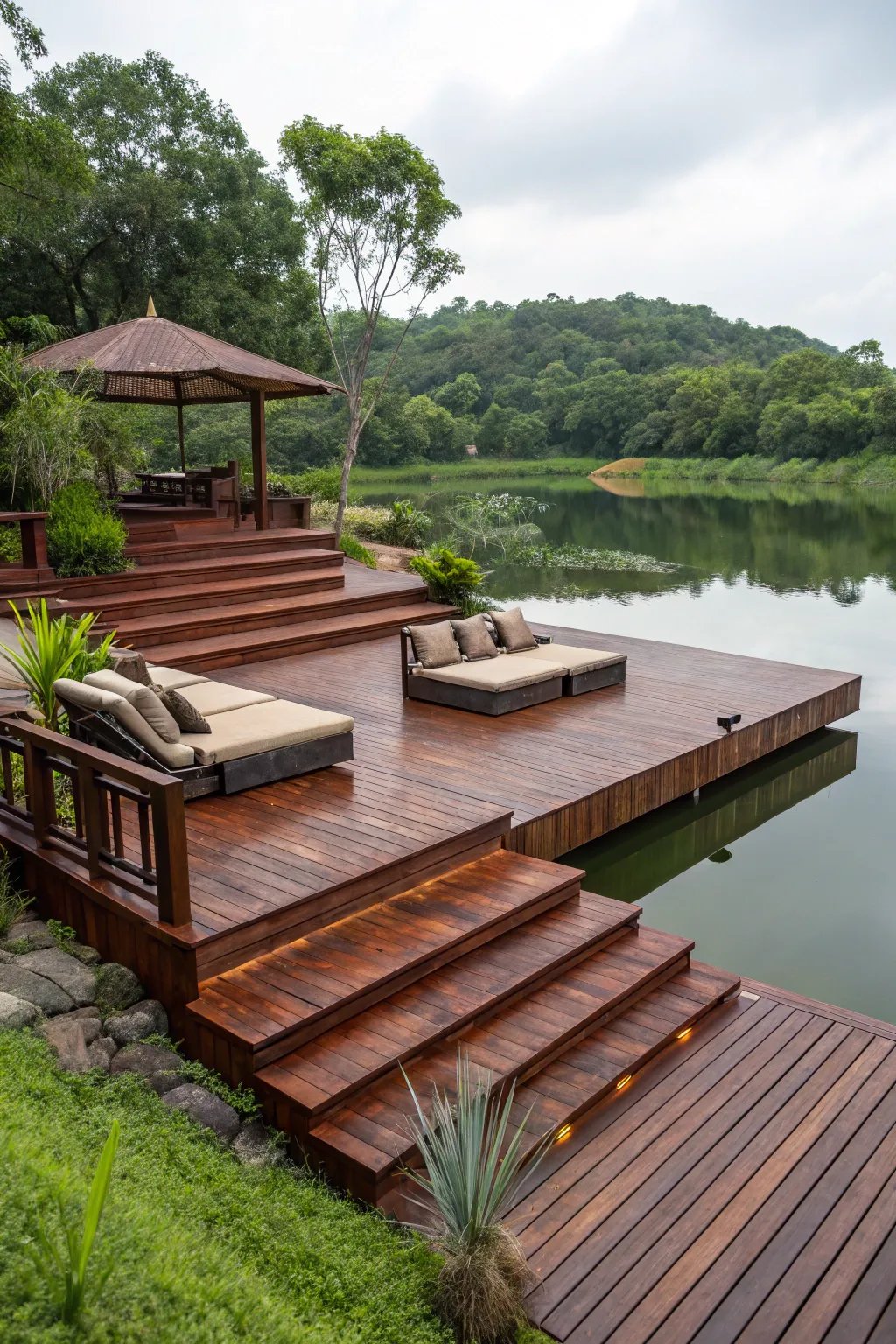 Fashion tiered levels for multiple relaxing zones. This approach, which I utilized for a friend’s venture, offers varied viewpoints and pursuits encompassing the lake.