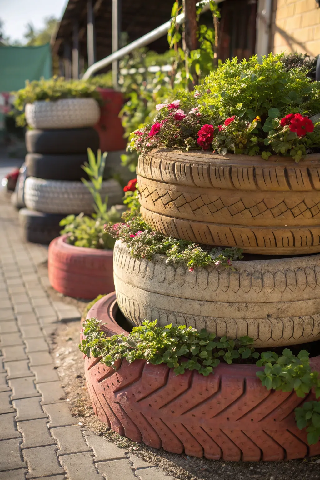 Position tires vertically to craft a tire pillar with plants cascading over the sides. It’s an unexpected and artistic focal point for any garden.