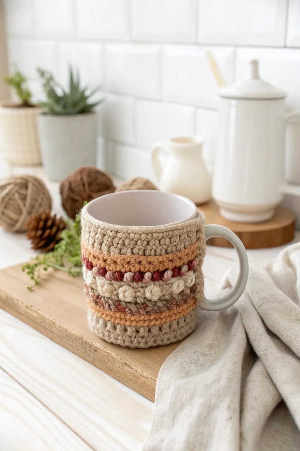 A cup wrap retains Dad’s coffee warmth and elegance. I crocheted one using his preferred shades, and now his morning custom feels notably special.