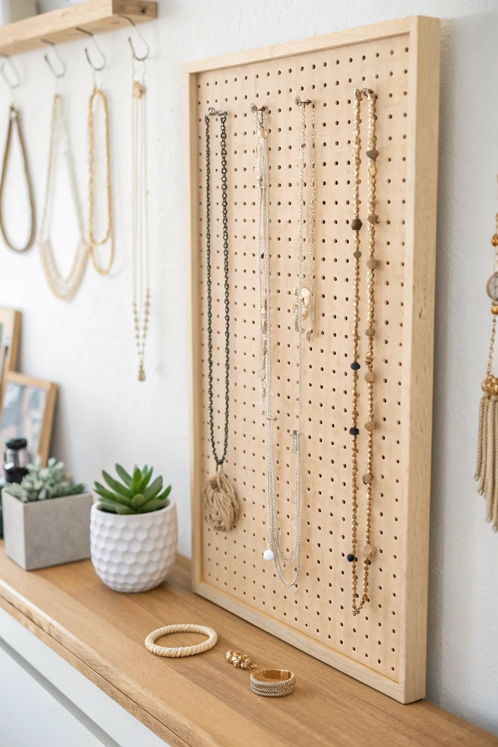 A pegboard can transform your jewelry into an eye-catching feature. I enjoy seeing all my necklaces and bracelets at a glance—it feels like having a personal boutique inside my closet!