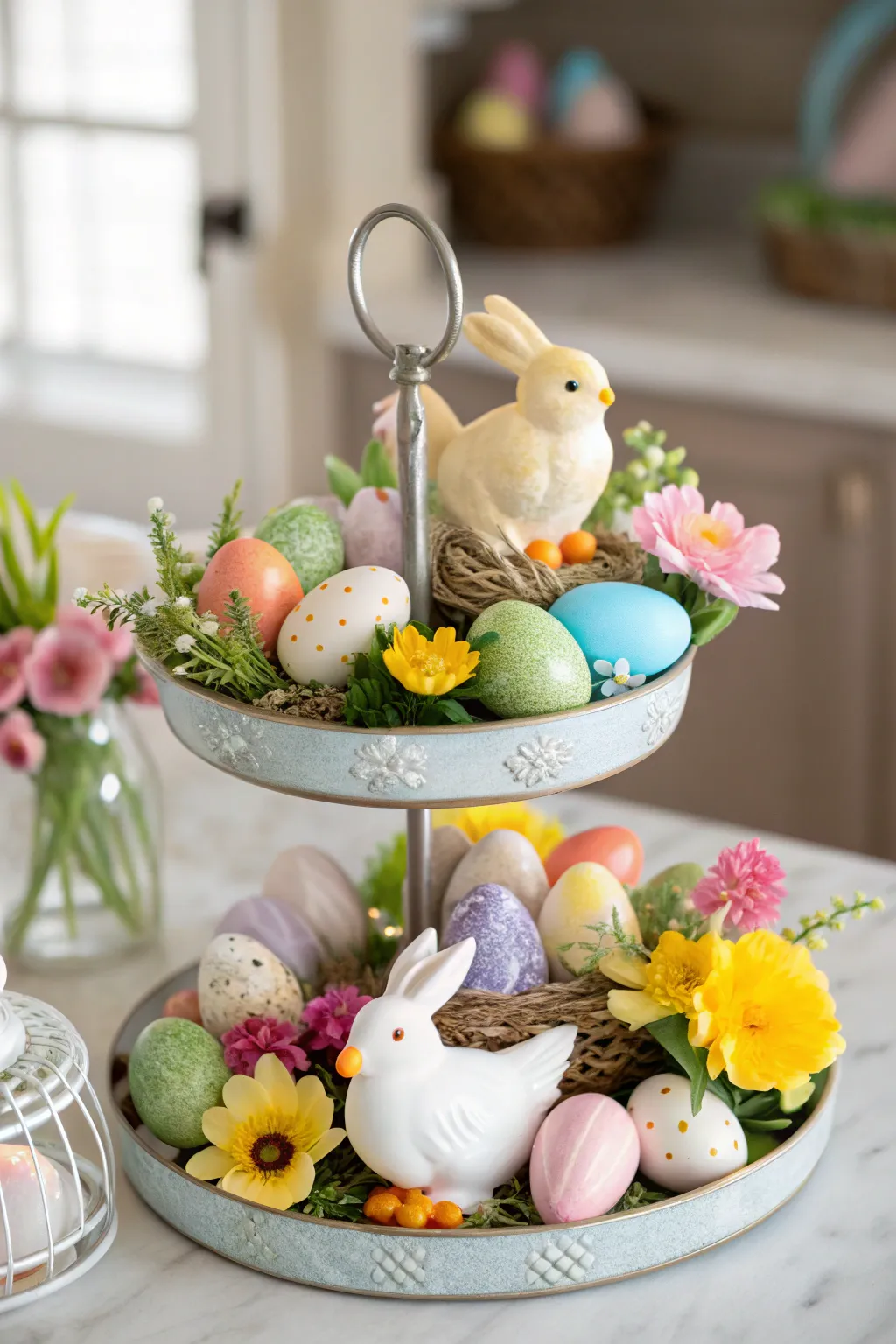 - Stone Rabbit Sculptures: Introduce allure with delightful stone rabbit sculptures that elevate your Easter tiered arrangement.