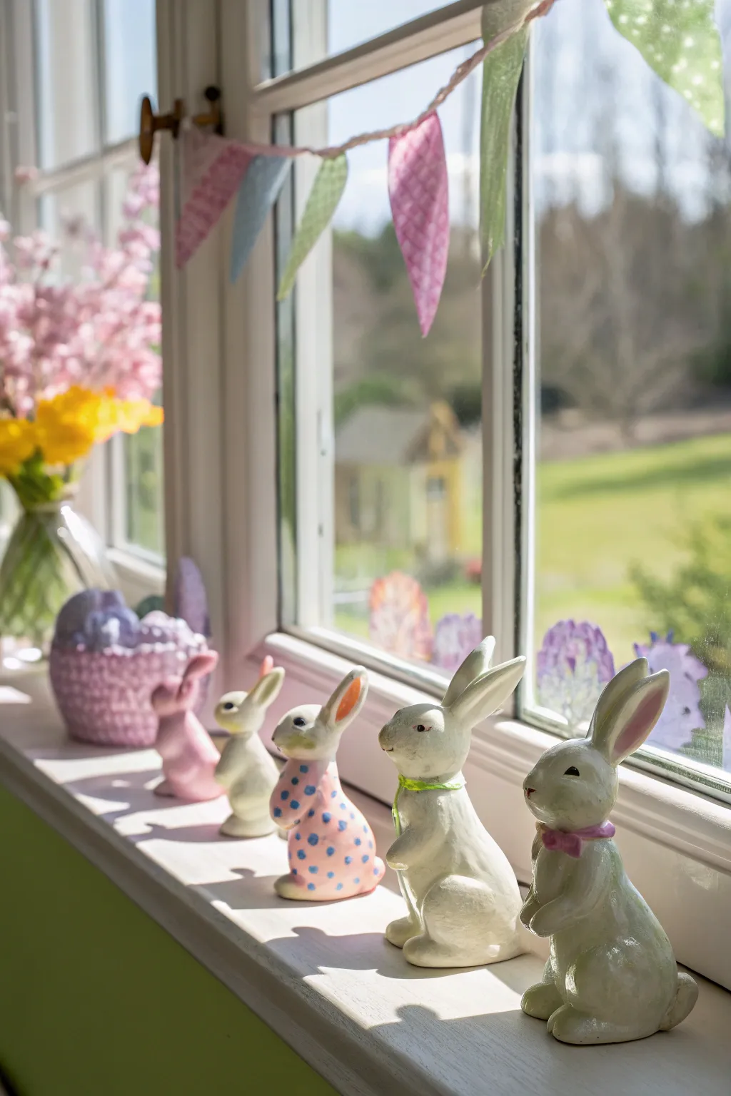 Organize a delightful rabbit line-up across your windowsill using ceramic or soft bunnies. This lively arrangement always makes me think of Easters from my childhood and adds a hint of sentimentality.