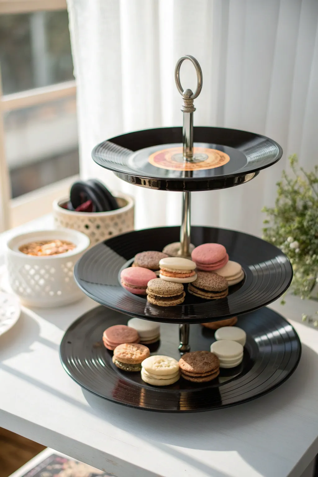 Stack records to craft a display tiers for serving treats. These are particularly useful at parties, and your guests will adore the vintage feel.