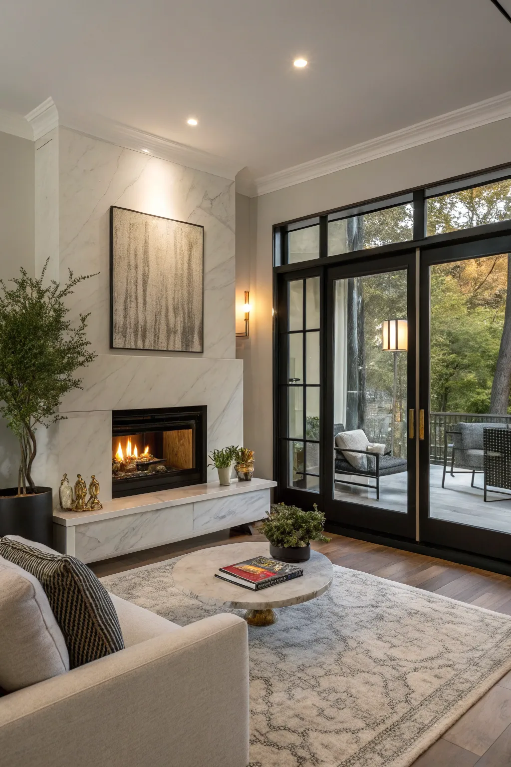 • Geometric Marble Fireplace Surround: Revamp your fireplace with a marble surround for a trendy, retro-inspired appearance.