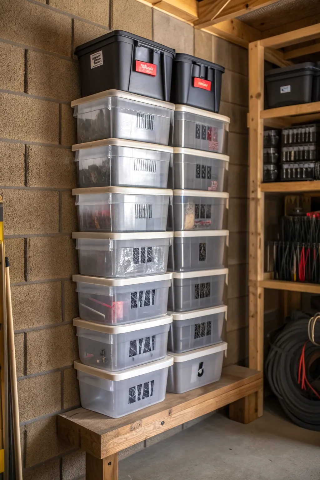 Elevate your garage organization with clear containers—see everything at a glance and keep your tools dust-free.
