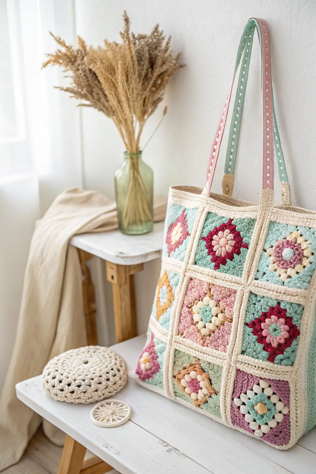 Fashionable and colorful: This handmade granny square carry-all is your go-to for simple style and practicality.
