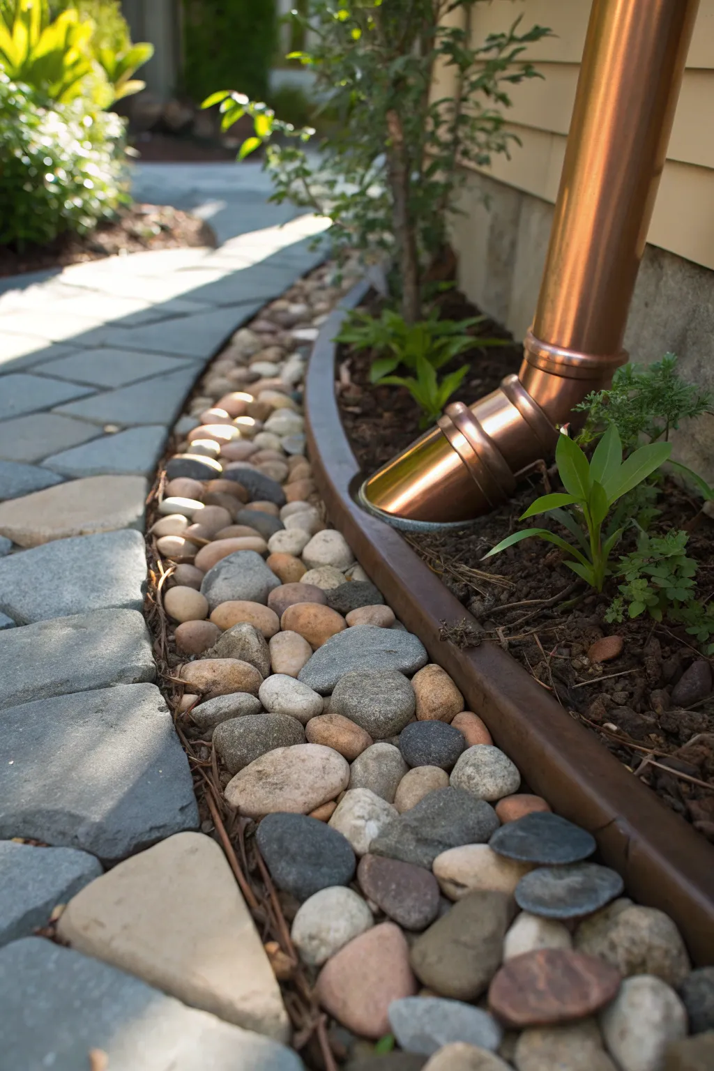 Why not transform your drainpipe into a standout feature by building a decorative waterway? I chose sleek stones and small rocks to design a miniature river leading away from my house, and it looks incredible!