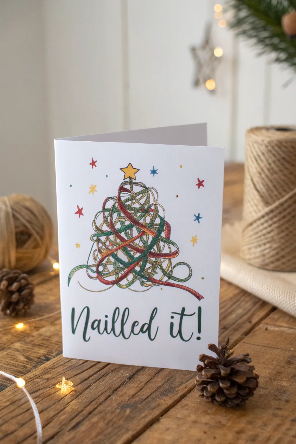 Design a card featuring a tangled heap of gift wrap and ribbon with ‘Got it!’ It’s a relatable festive struggle everyone can laugh about.