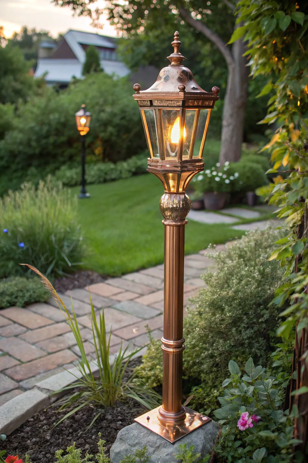 Inject a hint of elegance with a bronze lamp post. I fashioned one from bronze tubing, and it injects a warm glow and luxurious feel into my garden.