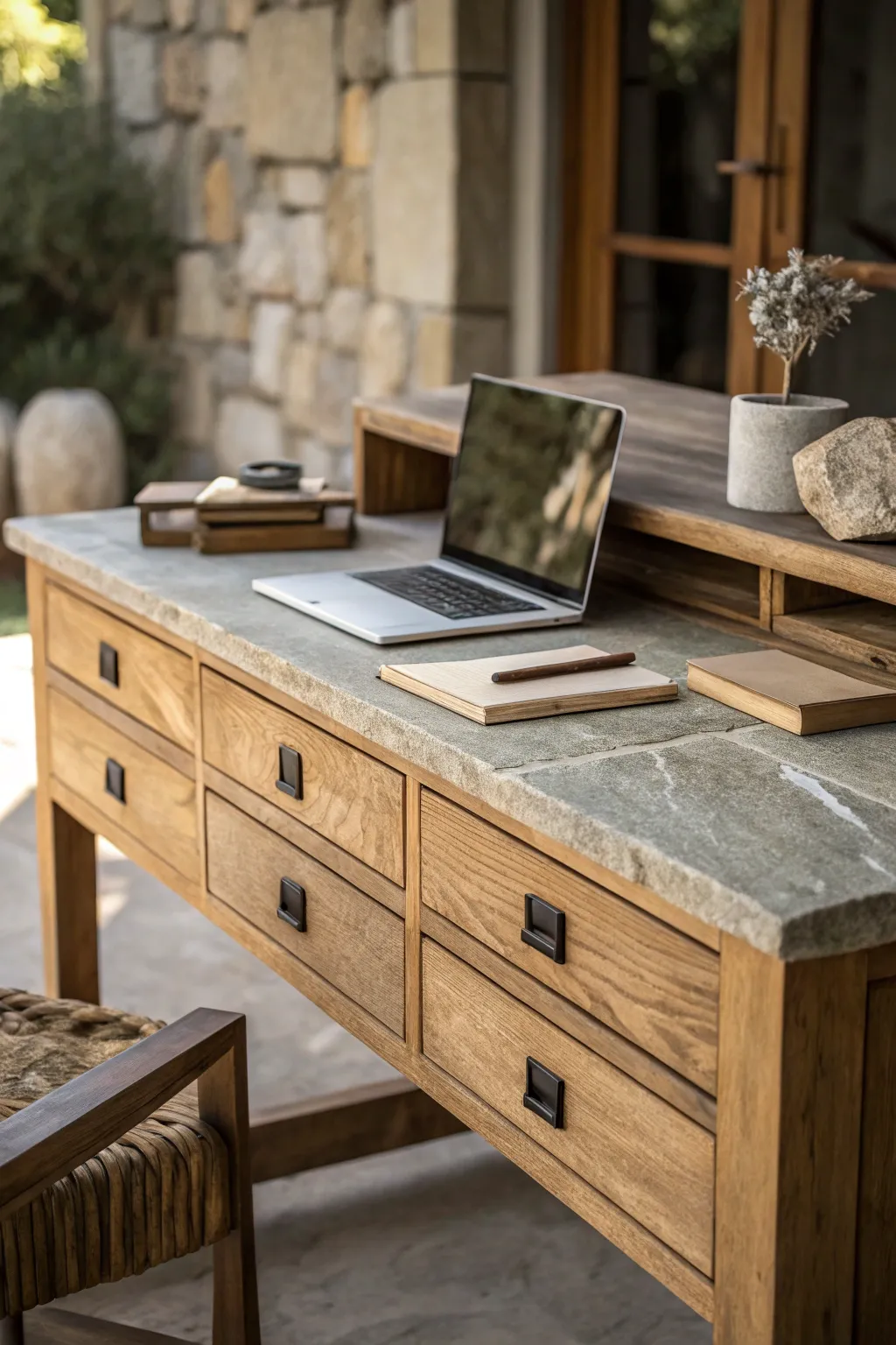 Using natural things like wood or stone can make your desk feel warmer. I like to add these things to make a space feel inviting.