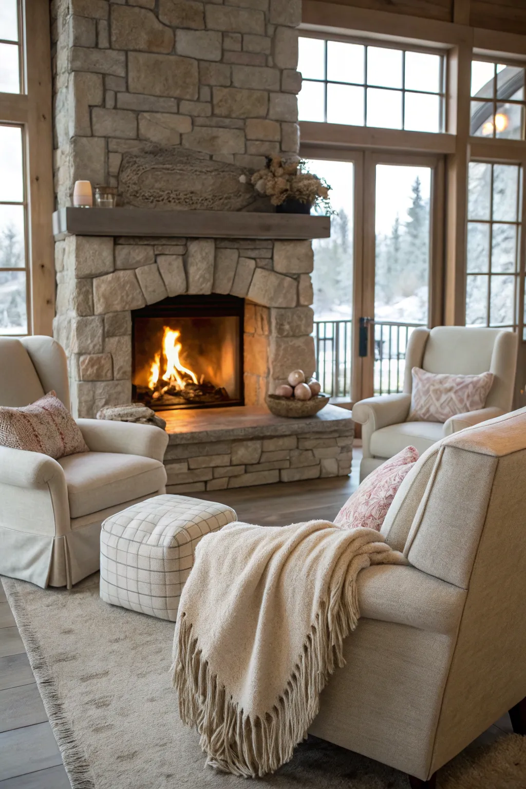 Incorporate varied textures around your fireplace to incorporate visual interest. I frequently blend gentle fabrics with the solid stone for a balanced and appealing aesthetic.