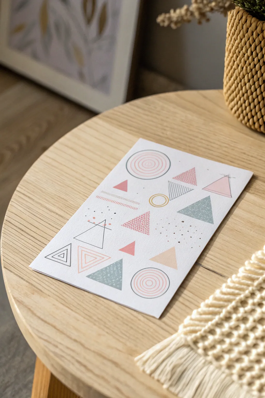 Employ geometric forms to create a sleek, contemporary postcard. I’ve discovered that playing with lines, circles, and triangles results in a pleasing, orderly design.