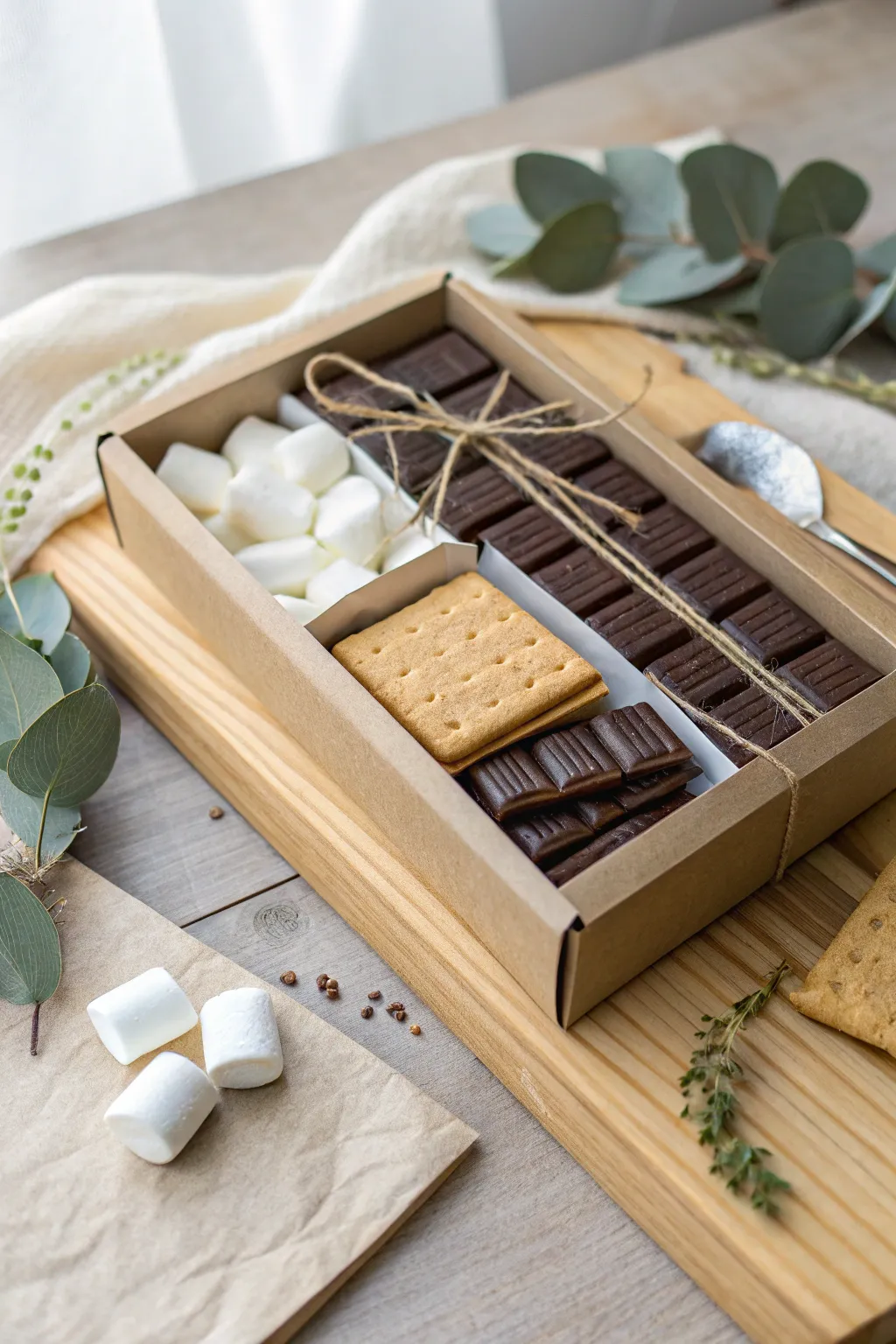 Pack graham crackers, chocolate, and marshmallows in a cute box for a sweet treat kit. It’s a sweet treat that brings a bit of outdoor fun indoors.