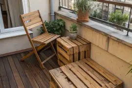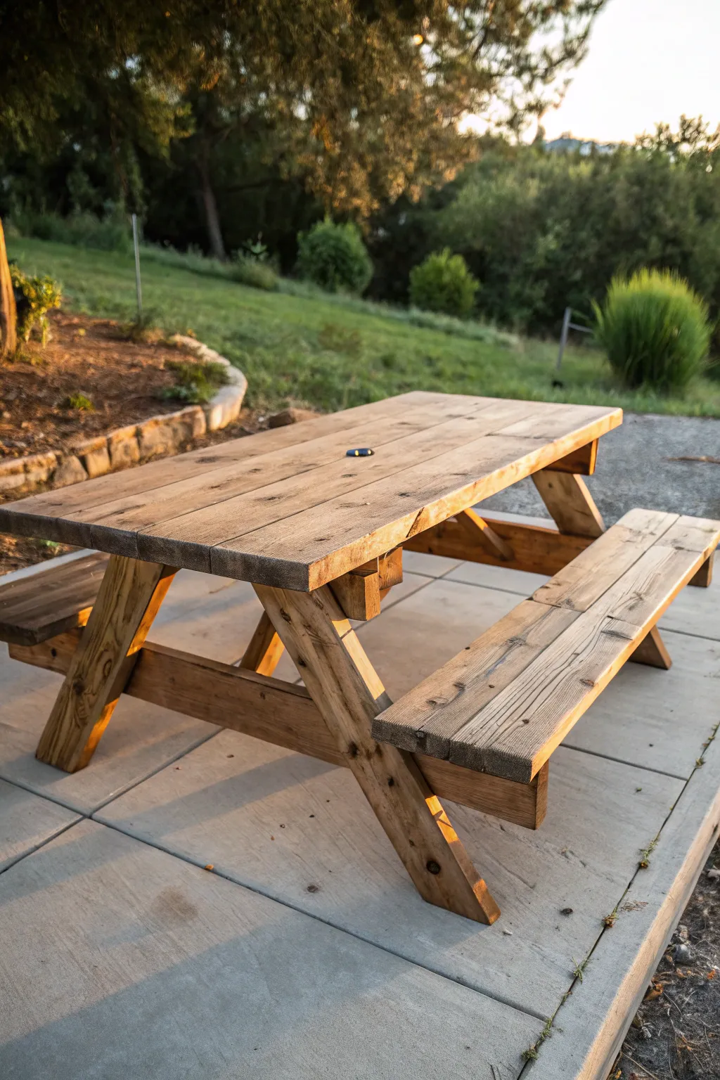 Elevate your patio with eco-friendly elegance: a reclaimed wood bench that blends craftsmanship and sustainability.