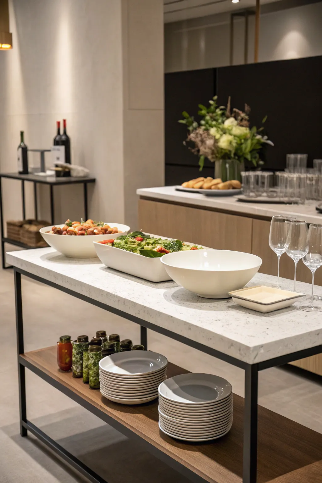 Combine textures like smooth ceramics and rustic wood to give your buffet depth. Textural contrast is a great trick to make even a basic setup more interesting.