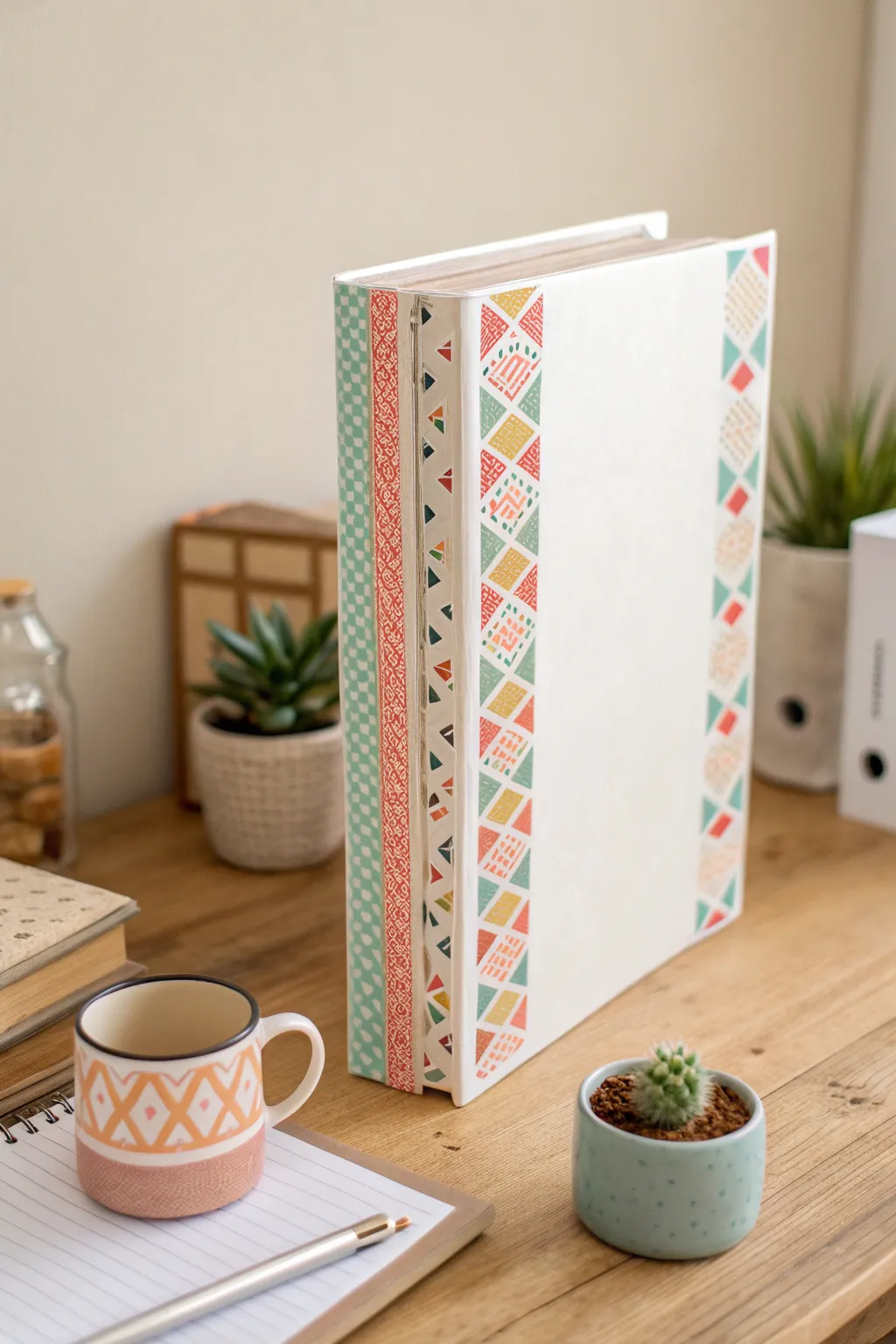 Embellish binders with tape for a personalized impression. This venture aided me in organizing my crafting materials while keeping everything stylishly coordinated.