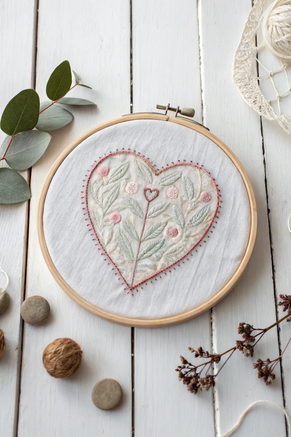 Employ a stitch frame as a frame for a heart-themed cloth art piece. It’s a straightforward yet elegant method to express creativity. I have a few of these around my home, introducing a hint of handmade charm.